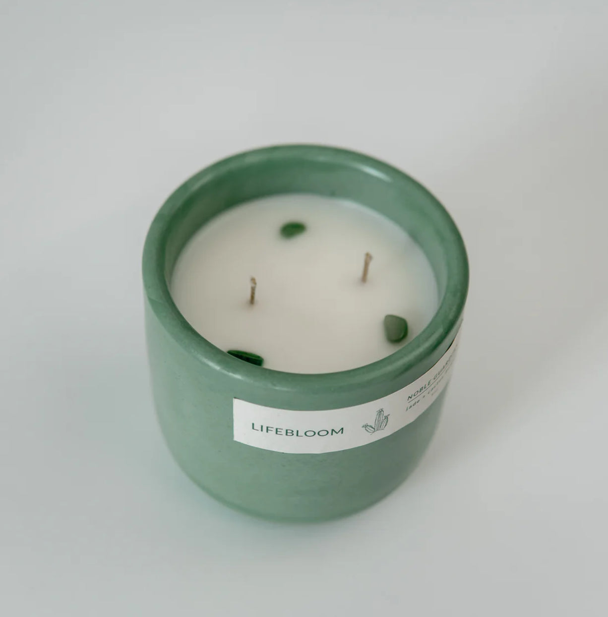 The serenity of jade and the unconditional love of cactus flower burst through protective, earthy layers, radiating brightness and warmth. Each scented candle is topped with genuine nephrite jade stones