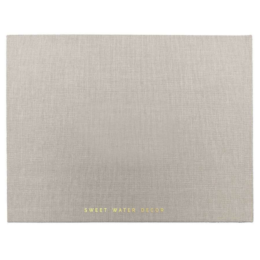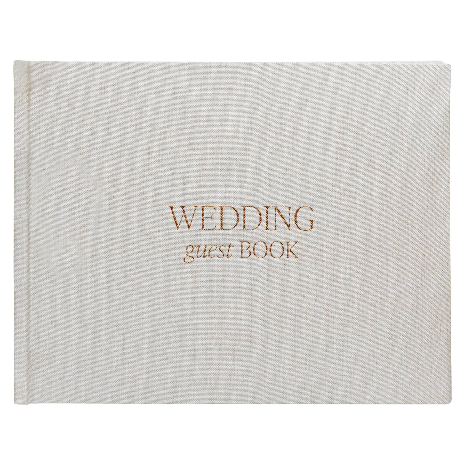Wedding guestbook with tan fabric cover and gold foil lettering, 100 sheets of unlined paper, 9.2" wide x 7.2" long.